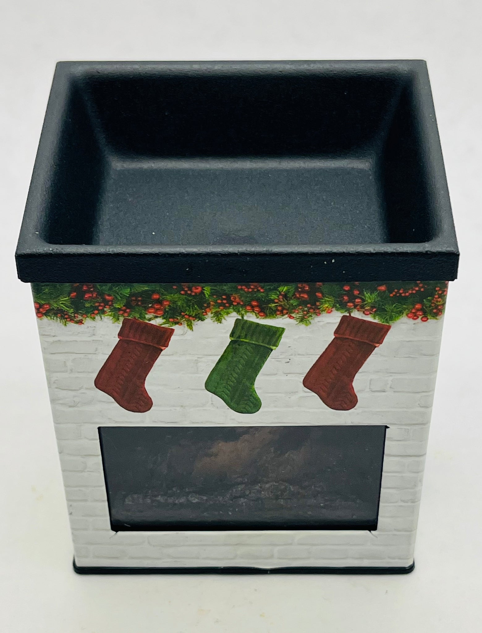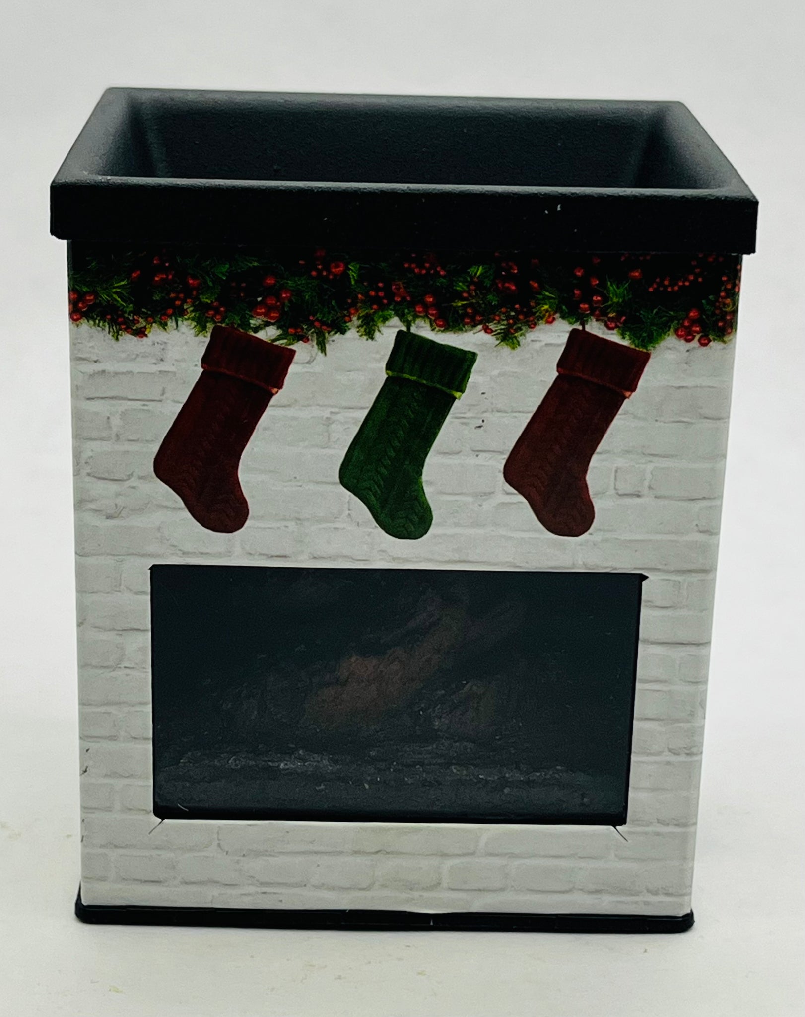 The stockings are hung with care on this white brick fireplace! It is made with metal and design is an applique. Light is LED and does not need to be replaced. Warms with an internal warming element.