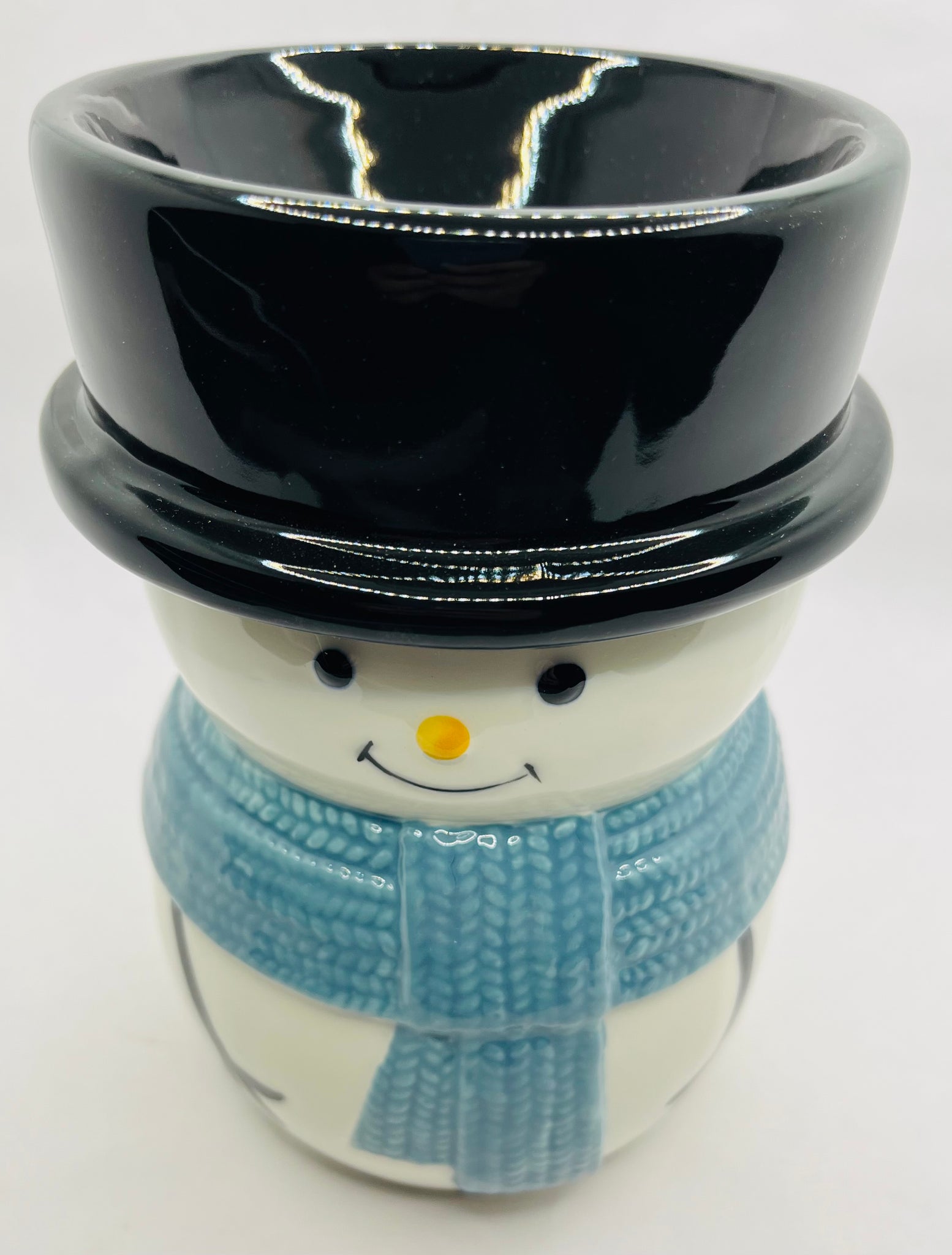 Welcome the holiday spirit with our cute Snowman Warmer, featuring a smiling Snowman with a blue scarf and black top hat. This cheerful warmer emits a warm, cozy glow when lit, adding festive charm to your décor—perfect for holiday gatherings or relaxing evenings by the fire.