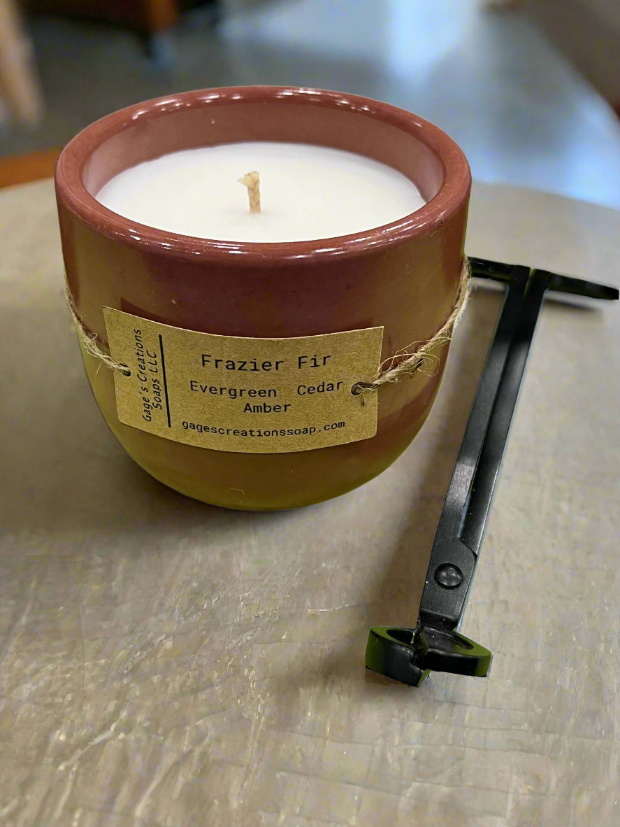 Our Frazier Fir candle is the perfect candle for all year round! This candle's scent evokes a festive fragrance with a crisp forest aroma. Mild citrus top notes with an earthy and woodsy, balsam core that makes you think it’s winter time. The beautiful, green trees on top gives it that extra touch of trees in the winter snow.