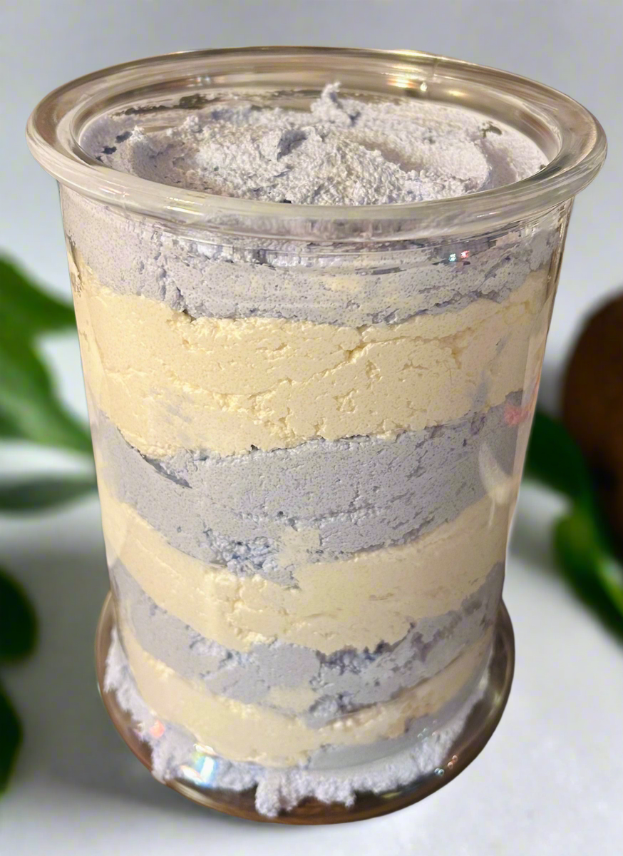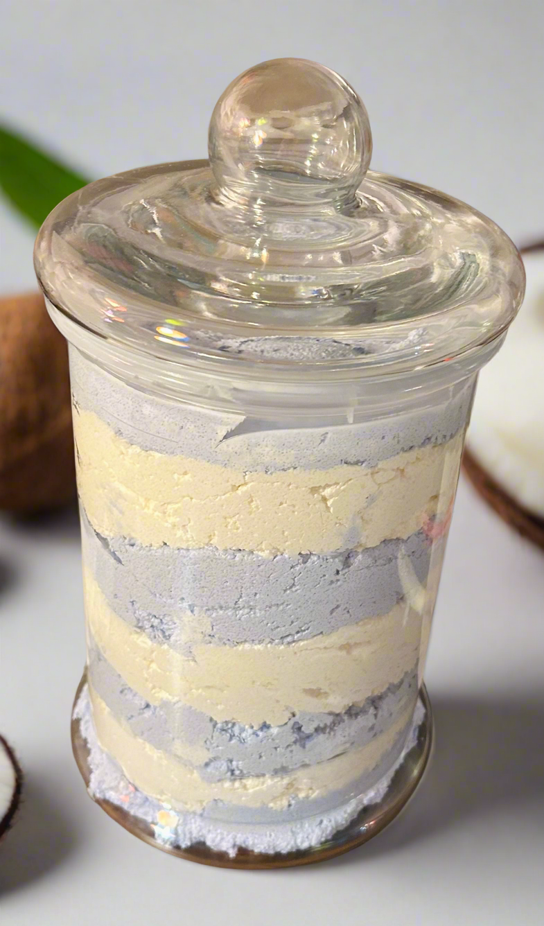 Our whipped Mahogany Coconut sugar scrub is perfect for our beach lovers!! It is a warm, aromatic mahogany with rich coconut, softened by a base of sandalwood, vanilla, and musk. It is a beautiful two toned product with white and light blue colors to remind you off laying on the beach relaxing while drinking a cold beverage.